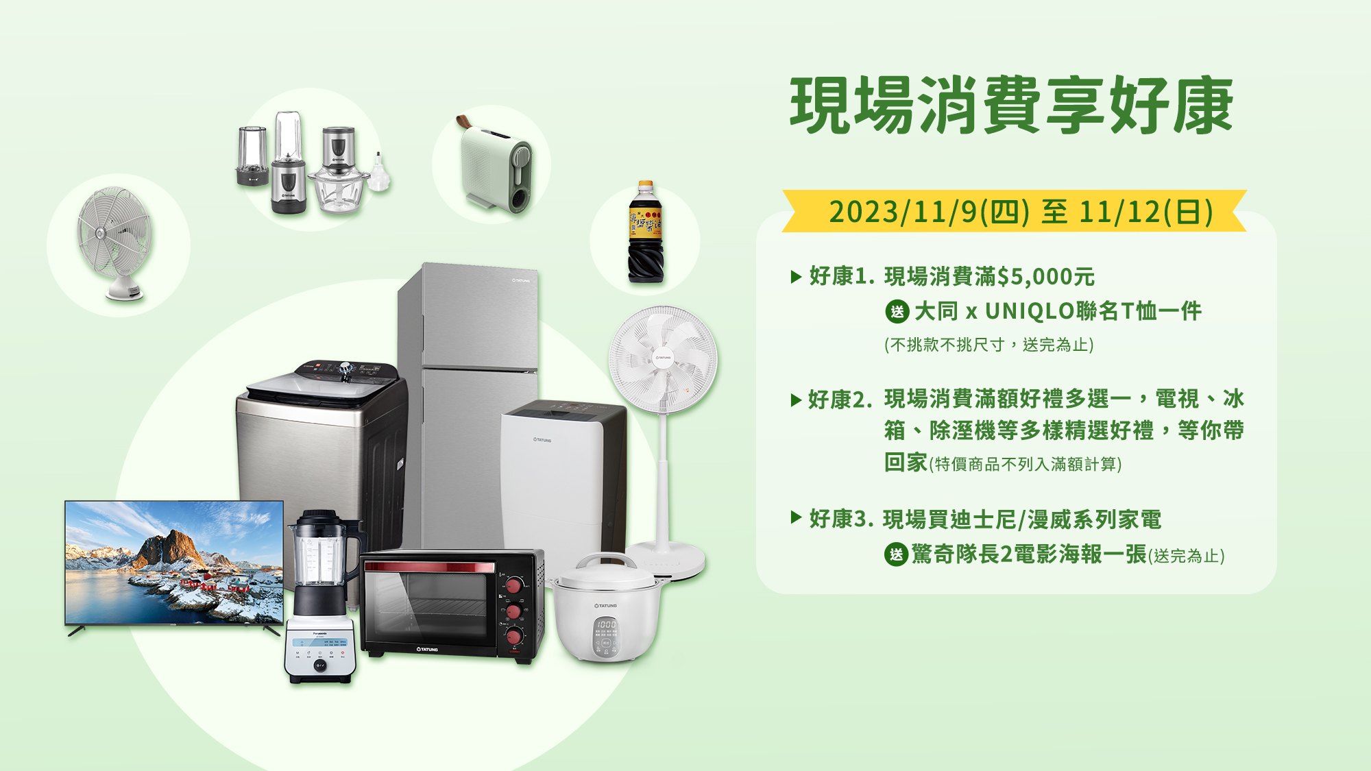 好康1:現場消費滿$5,000元,送大同×UNIQLO聯名T恤一件(不挑款不挑尺寸,送完為止)