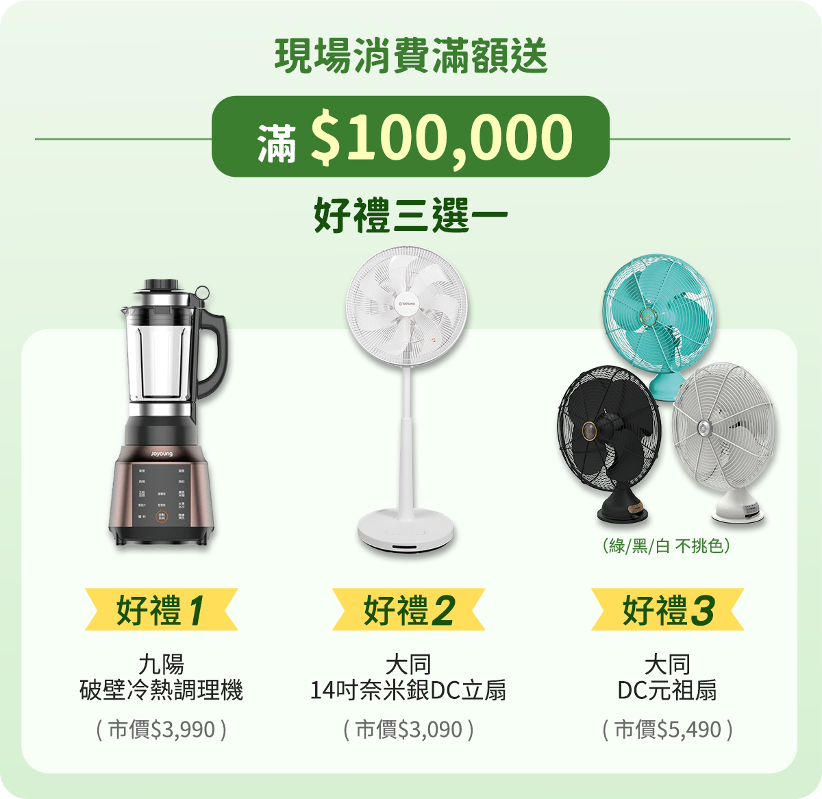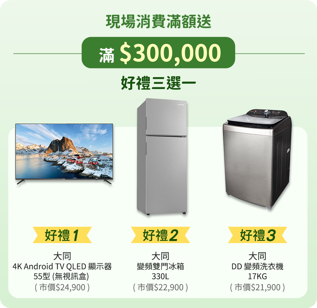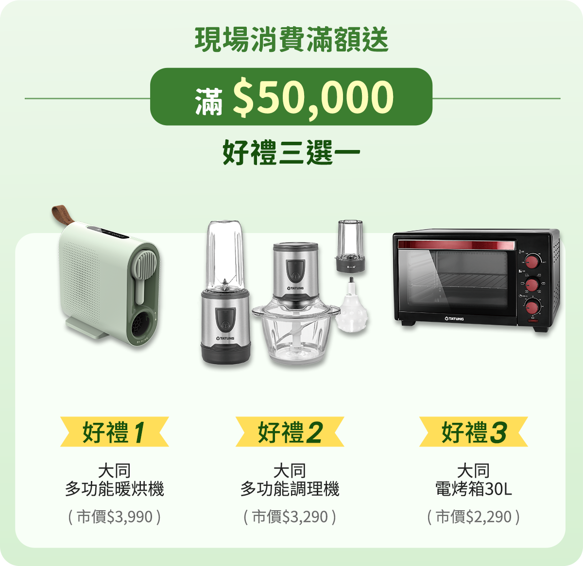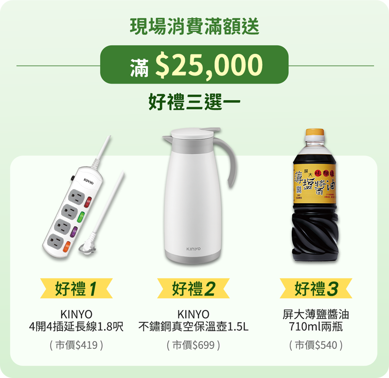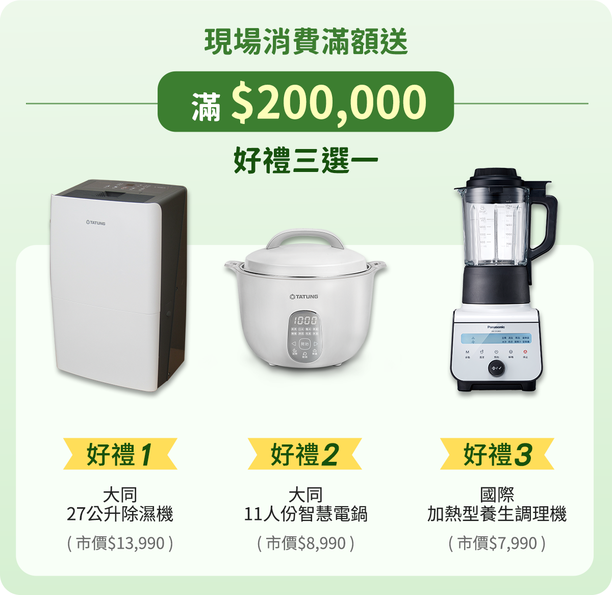 好康2:現場消費滿額好禮多選一,電視、冰箱、除濕機等多樣精選好禮,等你帶回家(特價商品不列入滿額計算)